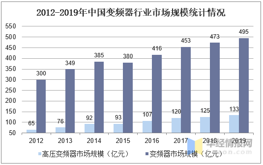 就墟市周围而言,我邦变频器行业的墟市周围举座呈上升态势,从2012年至2019年,中邦变频器行业周围除2015年有小幅度低浸以外,其余年份均处于稳步拉长状况。2019年我邦变频器行业的墟市周围到达495亿元,比拟2018年拉长4.7%。个中高压变频器自2012年起到2019年平素处于稳步上升的状况,每一年的拉长率都突出了变频器总墟市周围的拉长率,且7年间拉长了68亿元,拉长幅度突出100%。2019年我邦高压变频器墟市周围为133亿元,同比2018年拉长6.4%