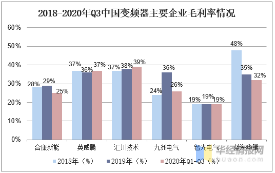 从我邦上市公司近几年的毛利率变更来看,变频器行业紧要上市公司的毛利率略有低浸,可是统统行业的得益水准较高,谋划效益优秀。2018年,6家上市公司的毛利率支撑正在20%-50%之间;2019年,各公司的毛利率分别进一步缩小,凑集正在30%-40%之间。2020年前三个季度,各公司的毛利率照旧众凑集正在25%-40%之间。而合康新能和汇川本领行动我邦变频器行业的龙头企业毛利率离别为25%和39%。