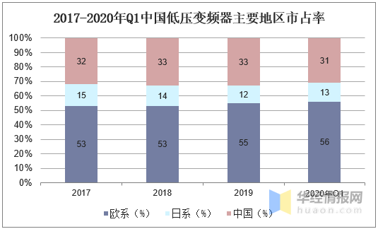 就墟市占据率而言,中邦低压变频器墟市以欧系为主,中邦占比约为三分之一,正在实行新一轮的摆设升级技改后,过去外资品牌正在这类下业的市占率较高。受技改的影响,2019年邦产物牌份额较2017年有小幅度的提拔,而占比最大的欧系部门正在2020年第一季的占比为56%, 较2017年上升了3%。